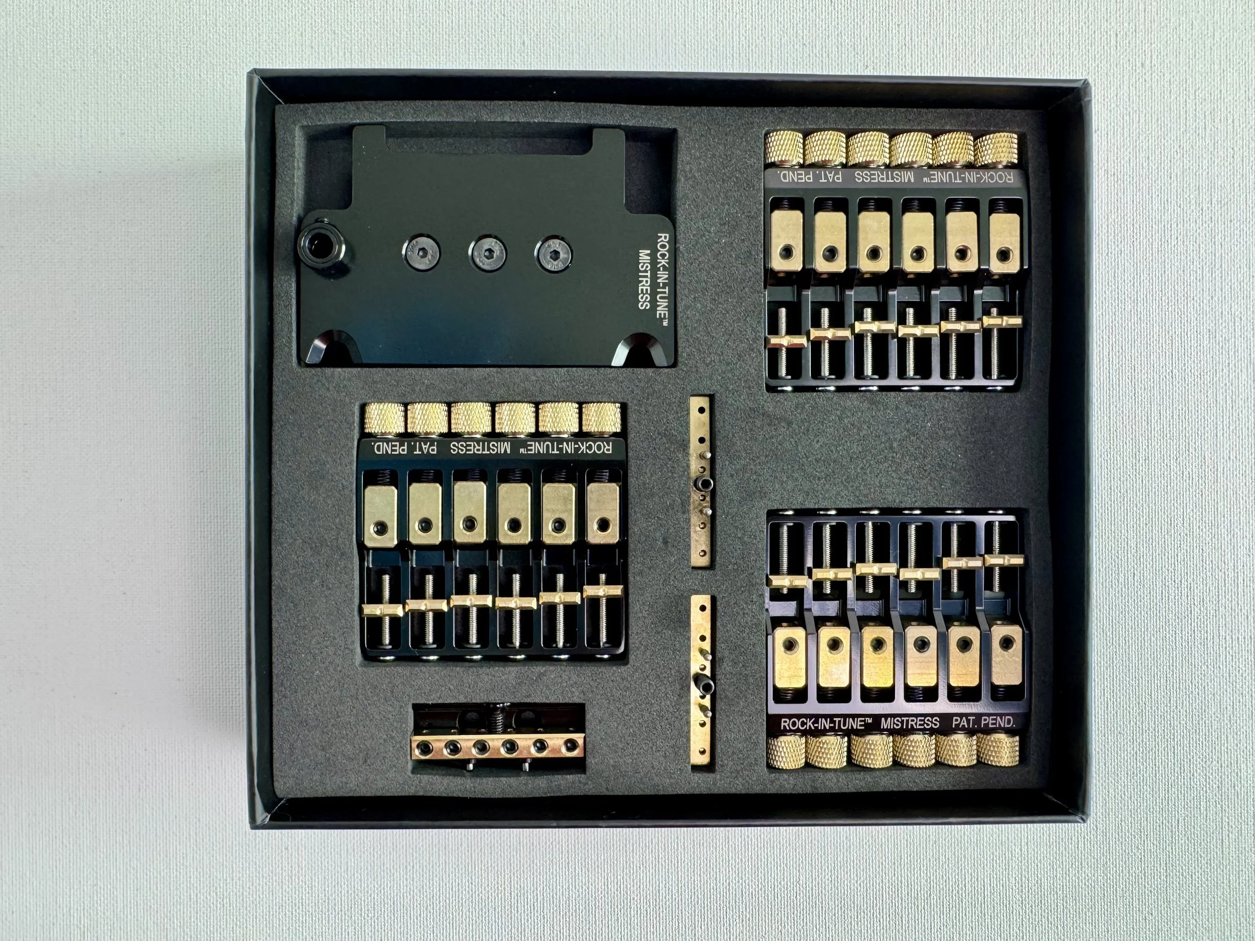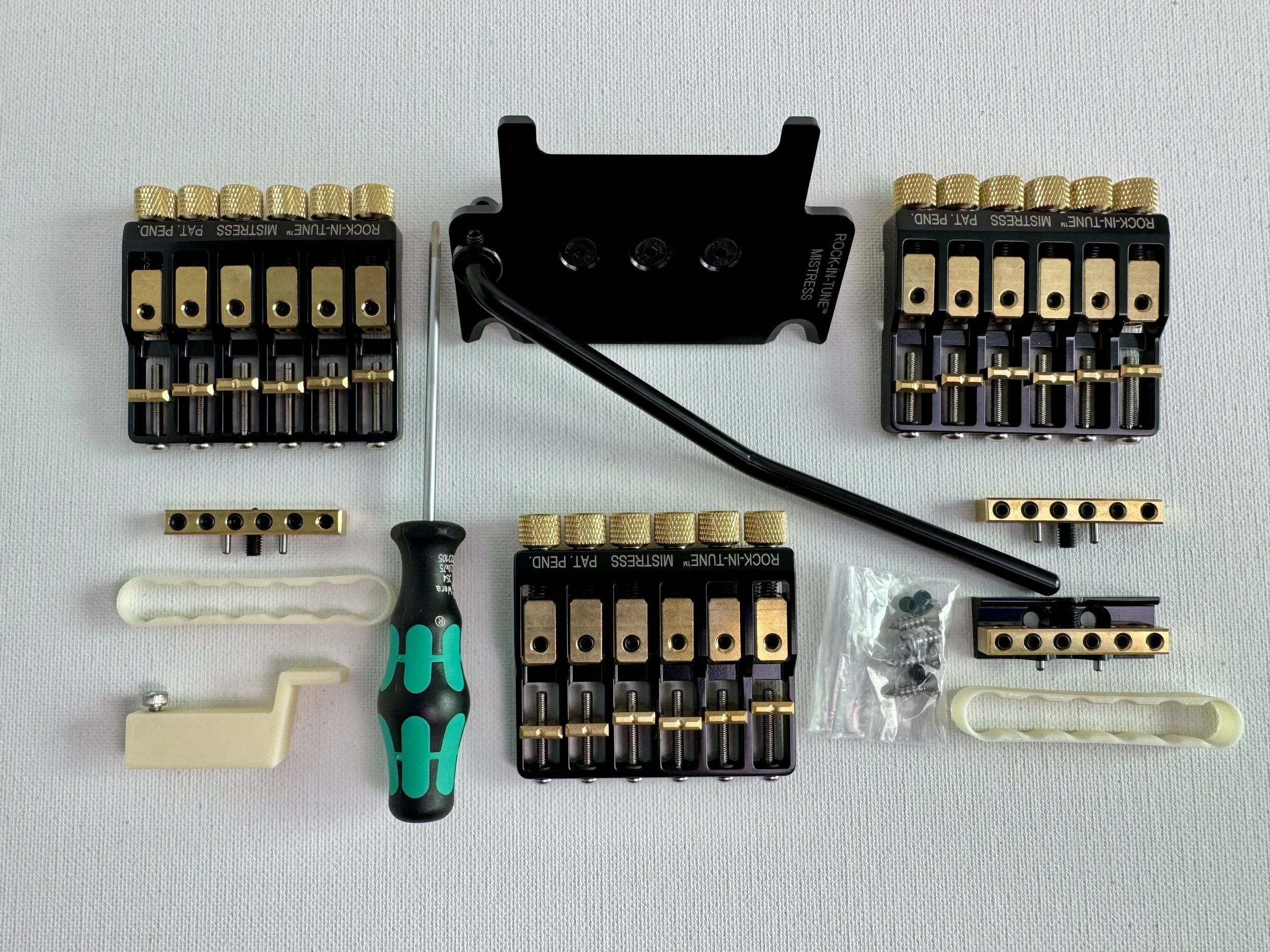 - 3 MISTRESS Modules (for 3 different tunings) - 1 bridge base-plate - 1 nut base-plate - 1 tremolo leveling tool - 1 2mm screwdriver - 4 wood screws for the nut base-plate installation.