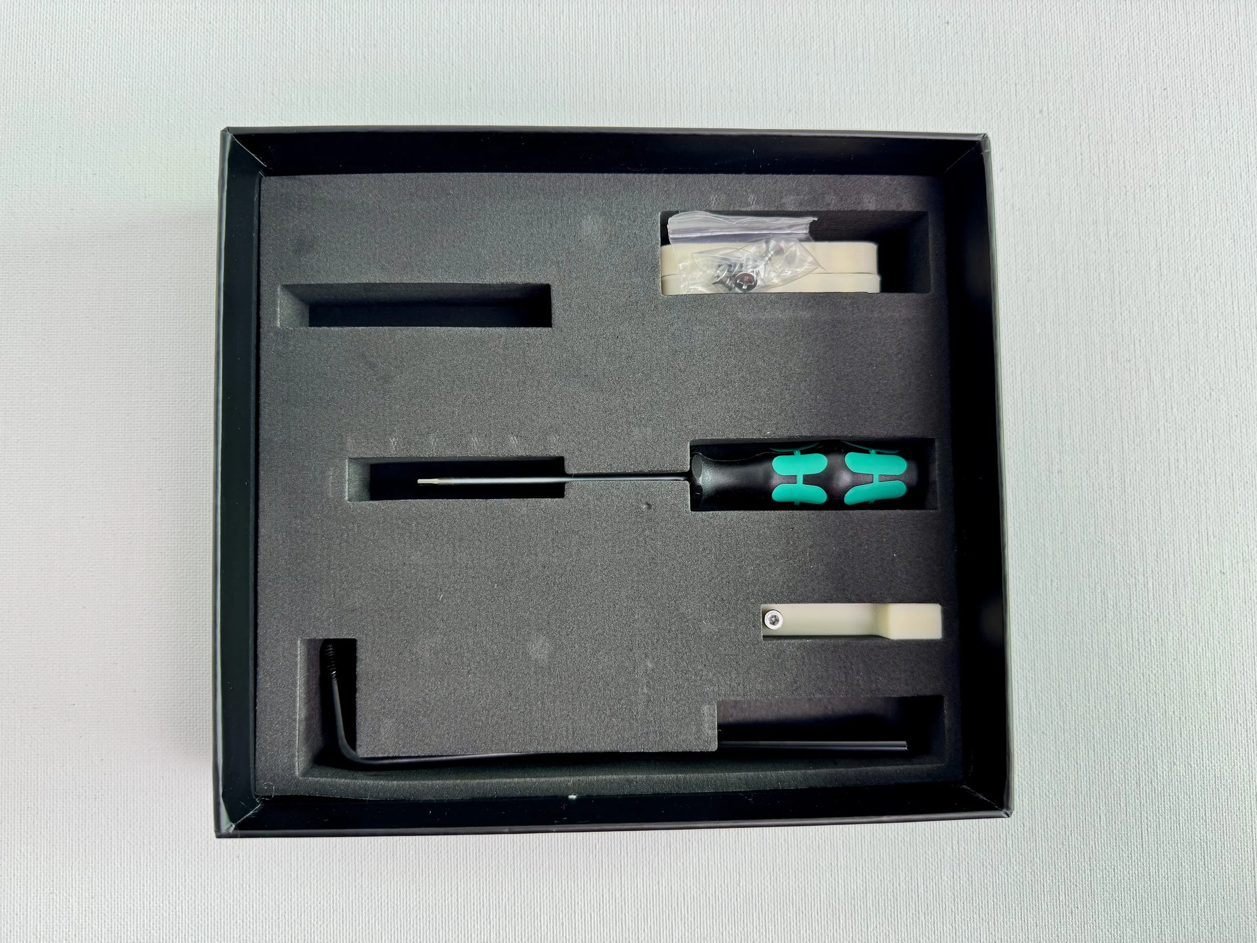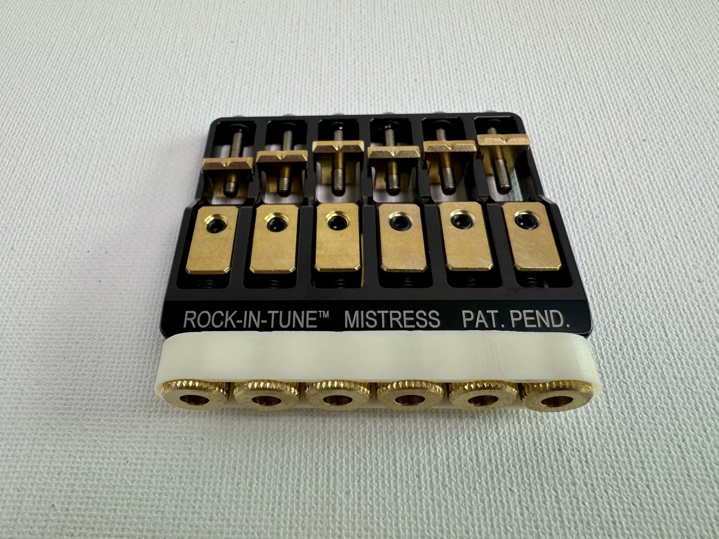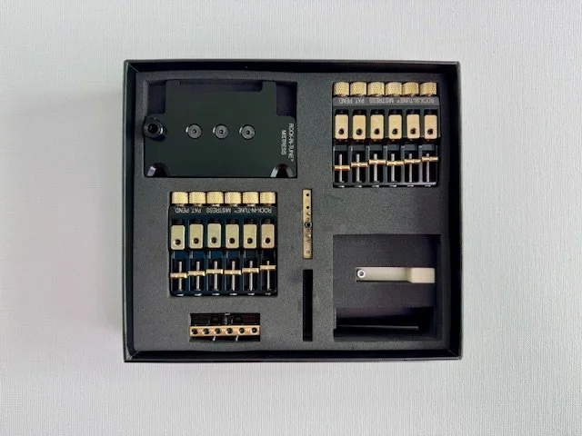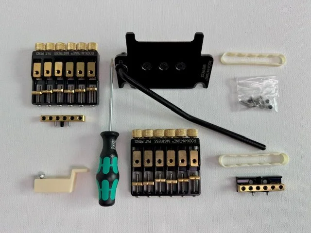 - 2 MISTRESS Modules (for 2 different tunings) - 1 bridge base-plate - 1 nut base-plate - 1 tremolo leveling tool - 1 2mm screwdriver - 4 wood screws for the nut base-plate installation.
