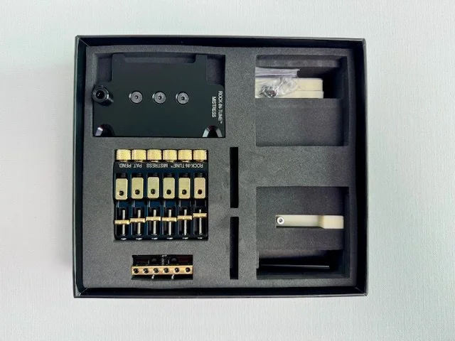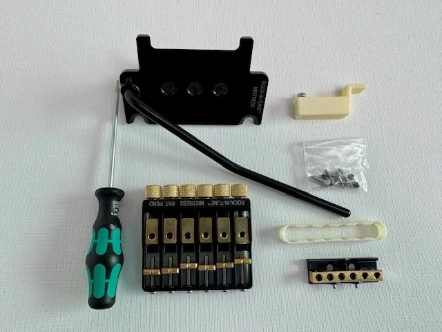 - 1 MISTRESS Module - 1 bridge base-plate - 1 nut base-plate - 1 tremolo leveling tool - 1 2mm screwdriver - 4 wood screws for the nut base-plate installation.