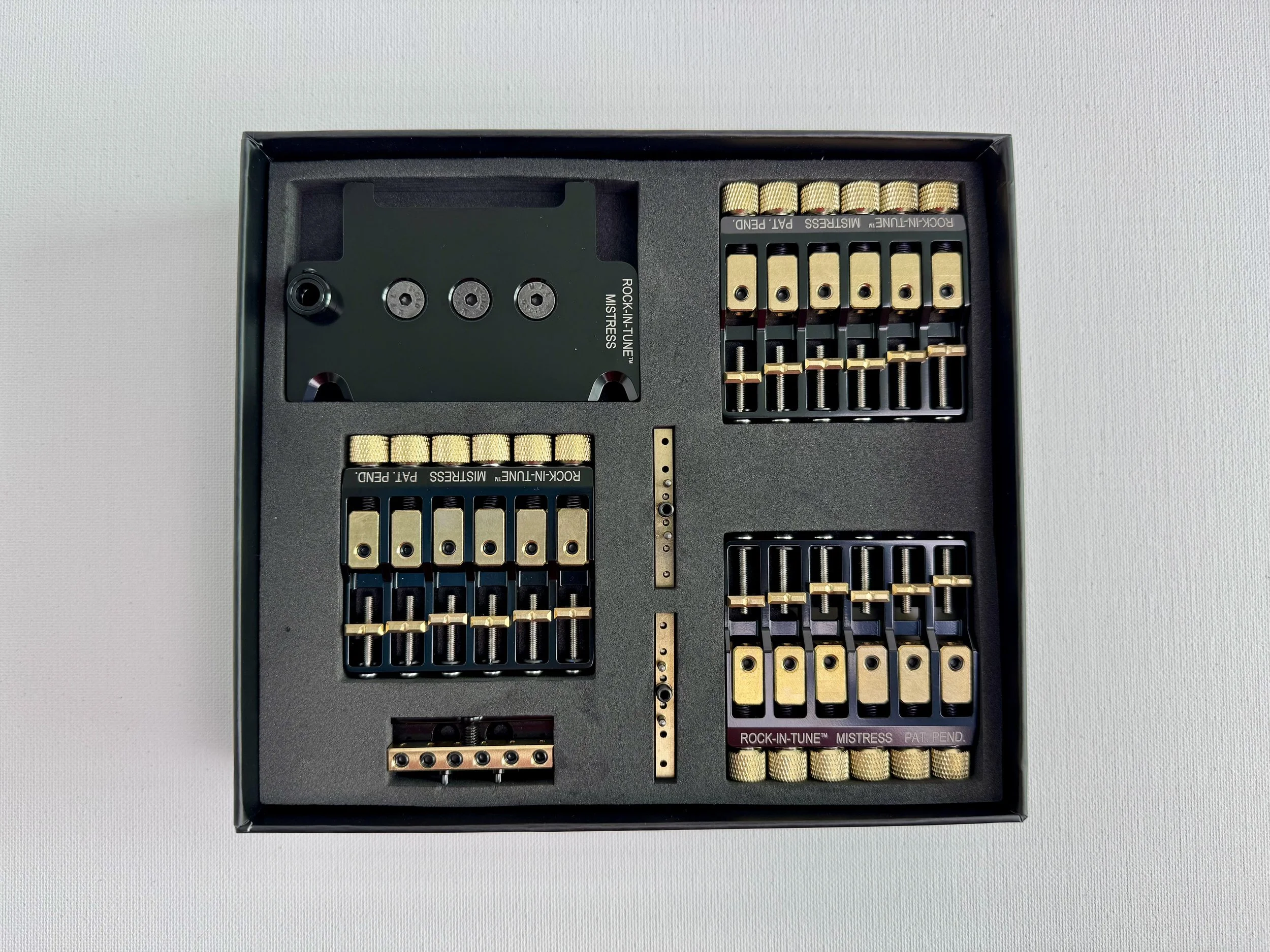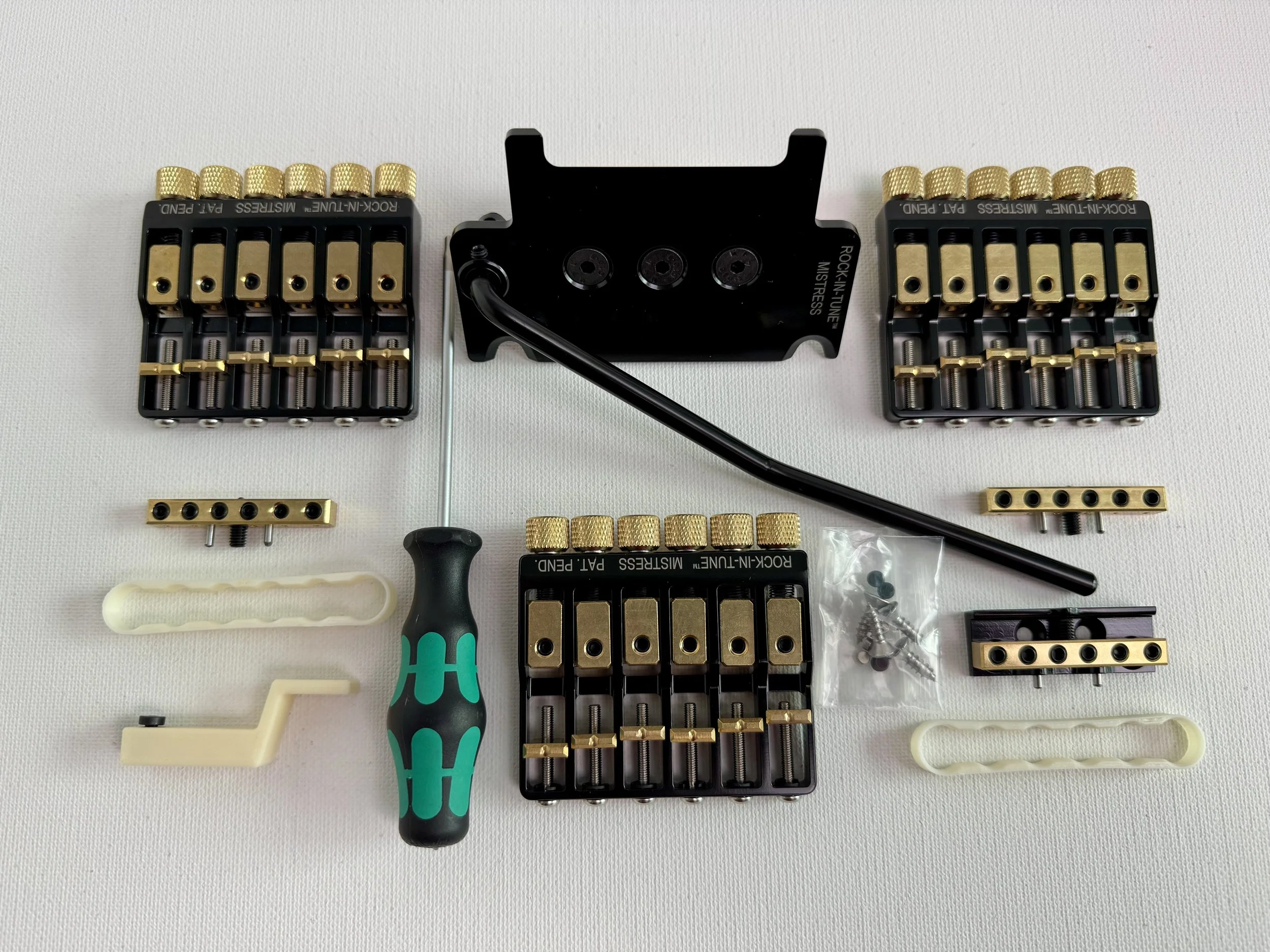 - 3 MISTRESS Modules (for 3 different tunings) - 1 bridge base-plate - 1 nut base-plate - 1 tremolo leveling tool - 1 2mm hex screwdriver - 4 wood screws for the nut base-plate installation.